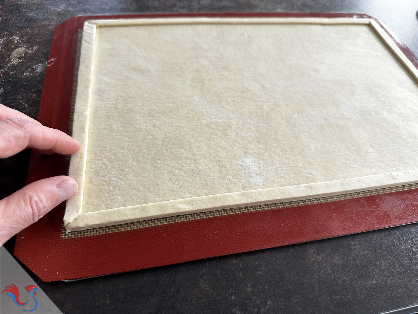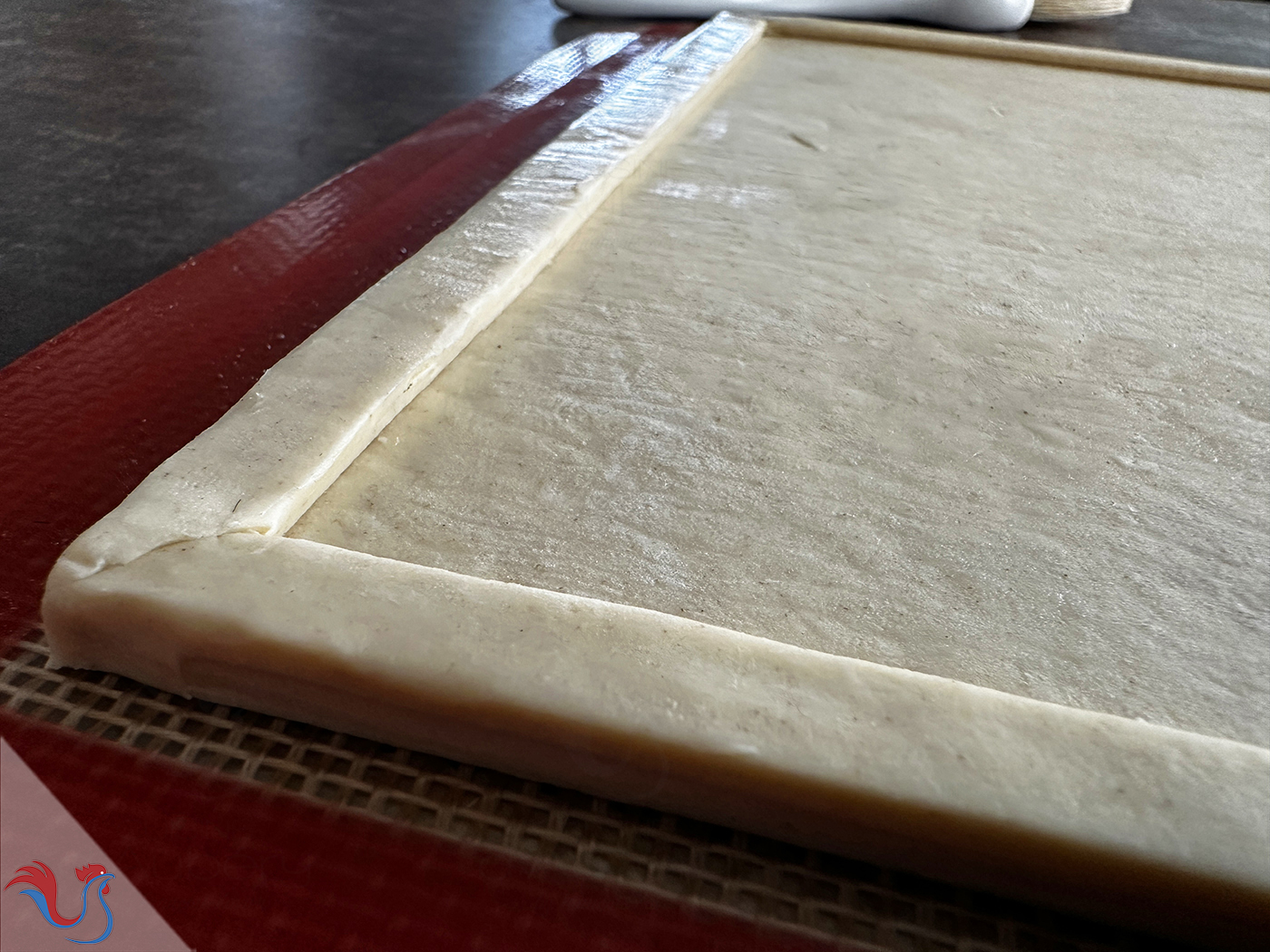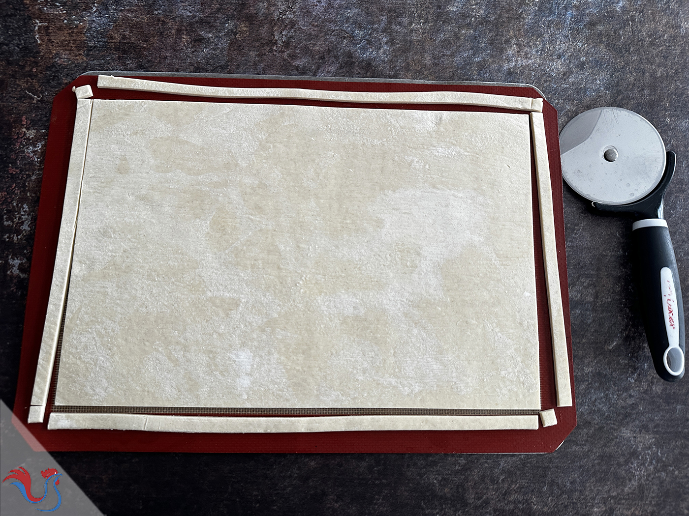 Je l'achète en magasin, de forme rectangulaire, pour professionnels. Ce n'est pas toujours évident de trouver cette forme en supermarché, mais vous pouvez tout simplement découper une pâte de forme circulaire et coller les morceaux, étaler légèrement, afin d'obtenir une forme rectangulaire.