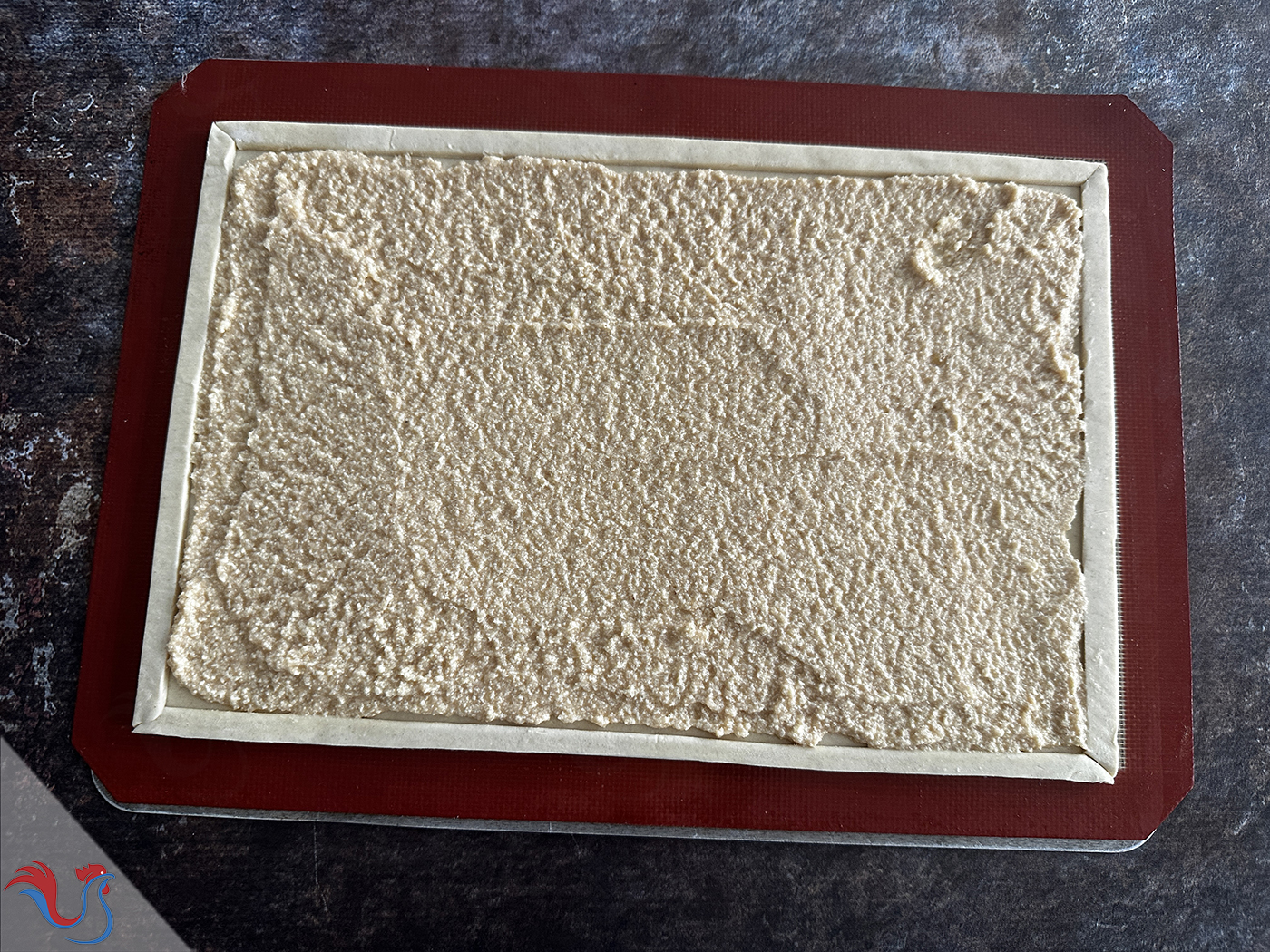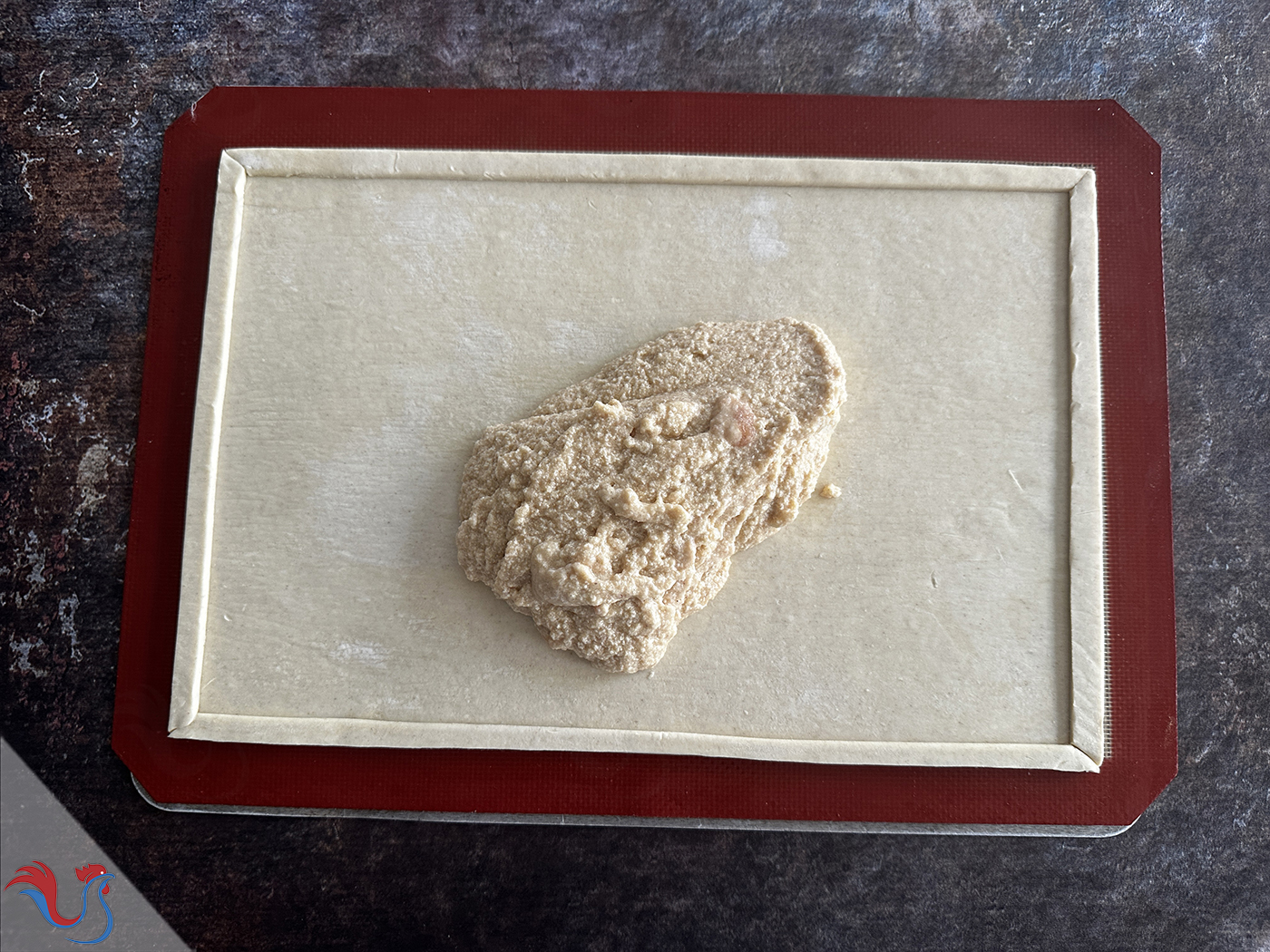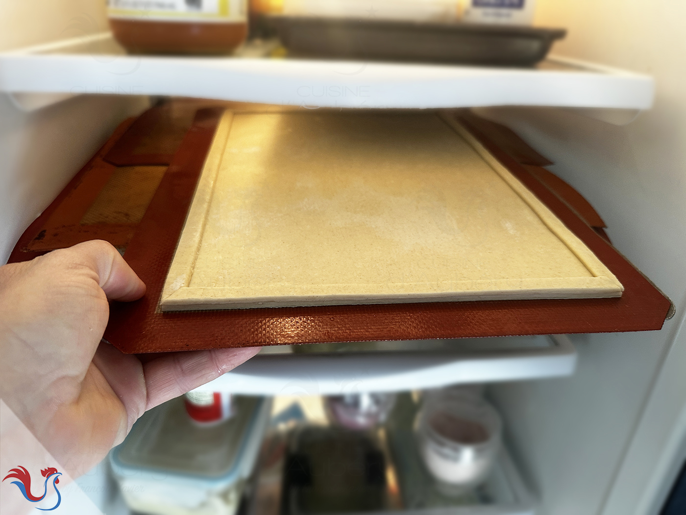 Je l'achète en magasin, de forme rectangulaire, pour professionnels. Ce n'est pas toujours évident de trouver cette forme en supermarché, mais vous pouvez tout simplement découper une pâte de forme circulaire et coller les morceaux, étaler légèrement, afin d'obtenir une forme rectangulaire.
