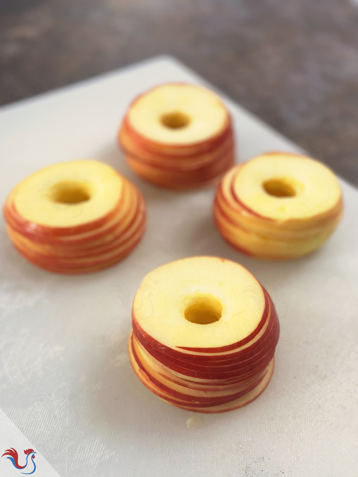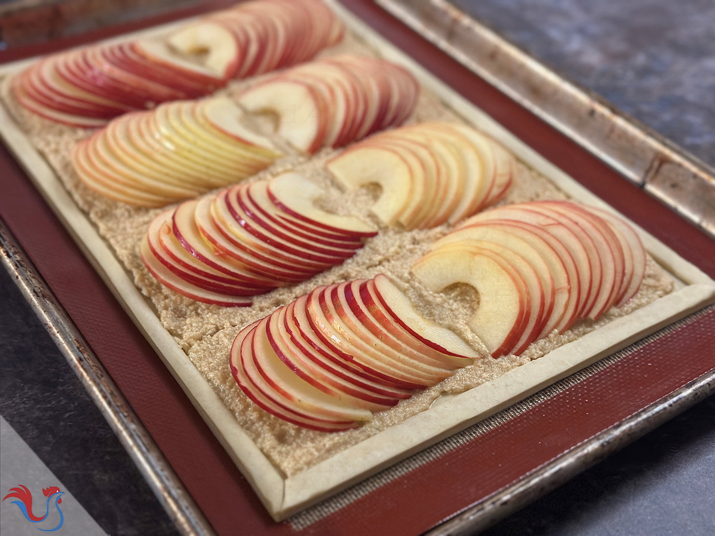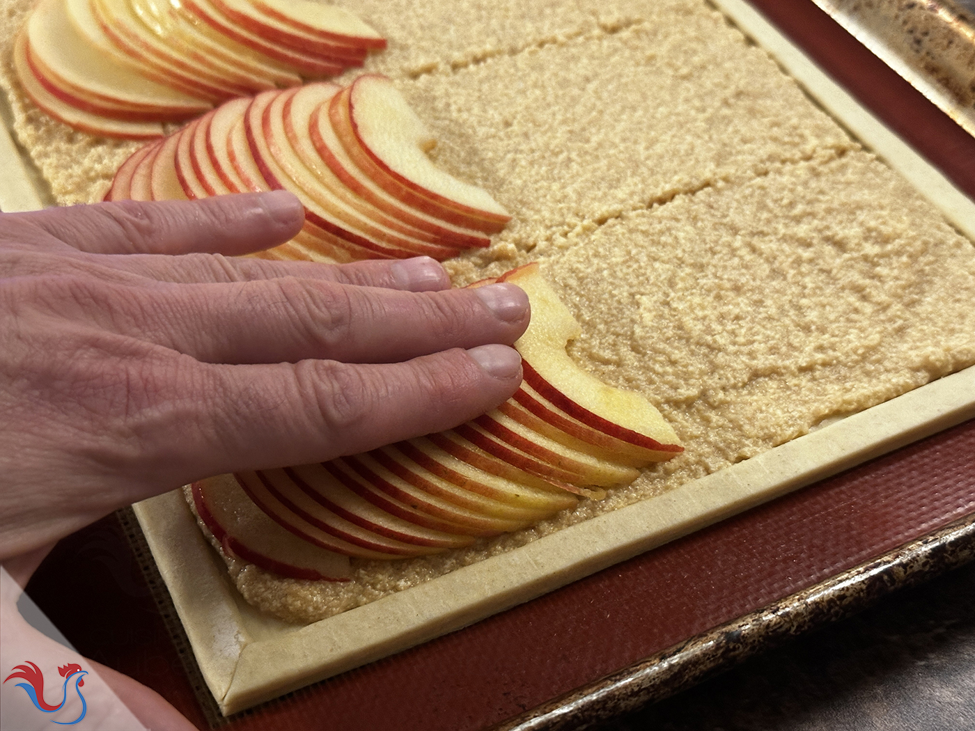 ● Pour 8 feuilletés : prendre une pâte 40 cm largeur x 26 cm hauteur et 4 pommes