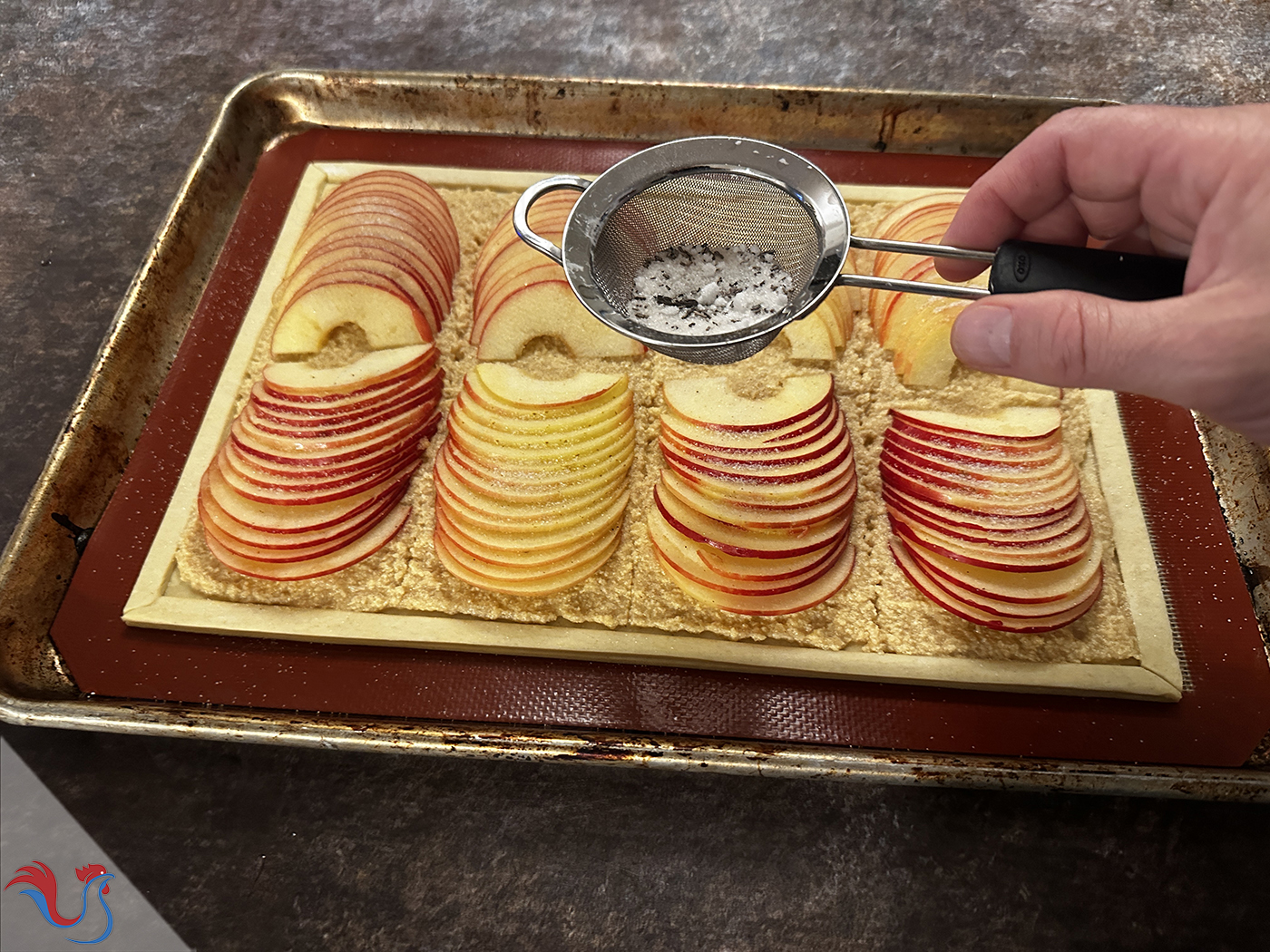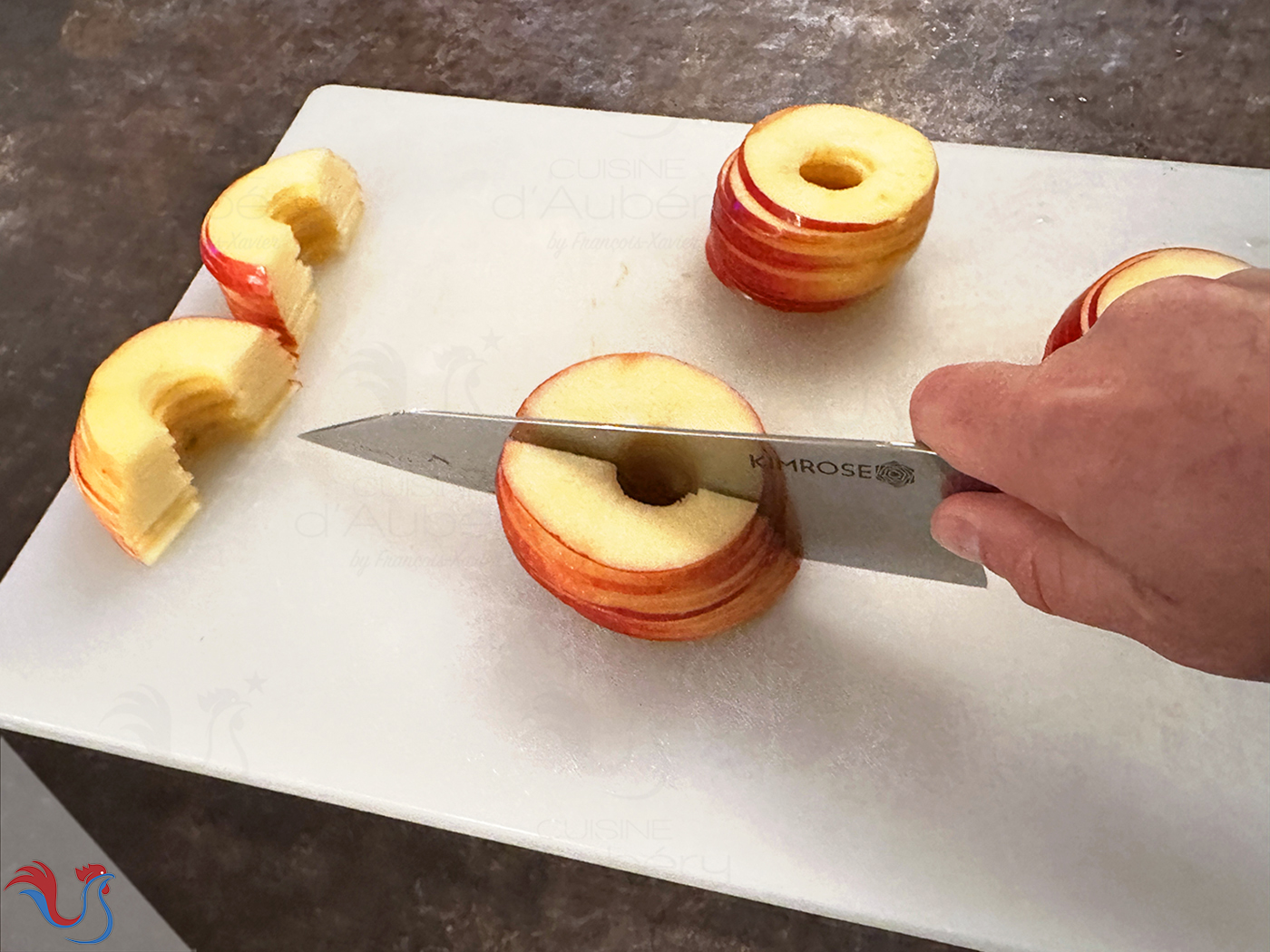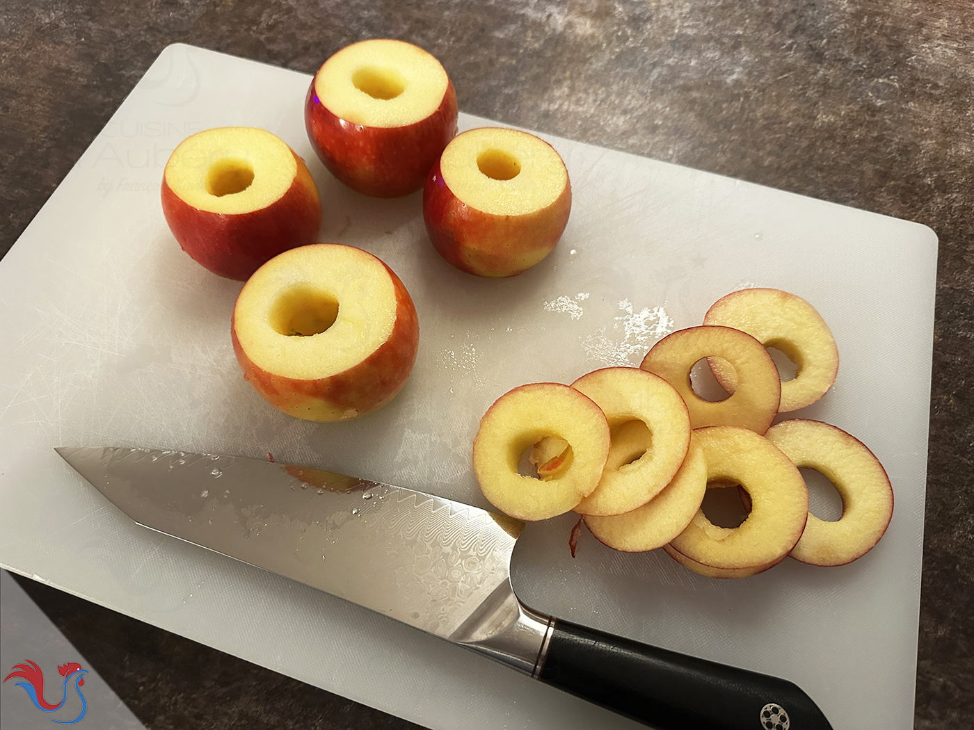 ● Pour 8 feuilletés : prendre une pâte 40 cm largeur x 26 cm hauteur et 4 pommes