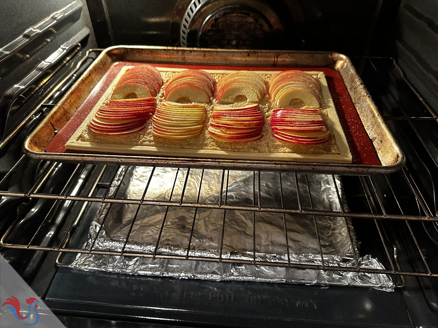 ● Pour 4 feuilletés : prendre une pâte 20 cm largeur x 26 cm hauteur et 2 pommes
