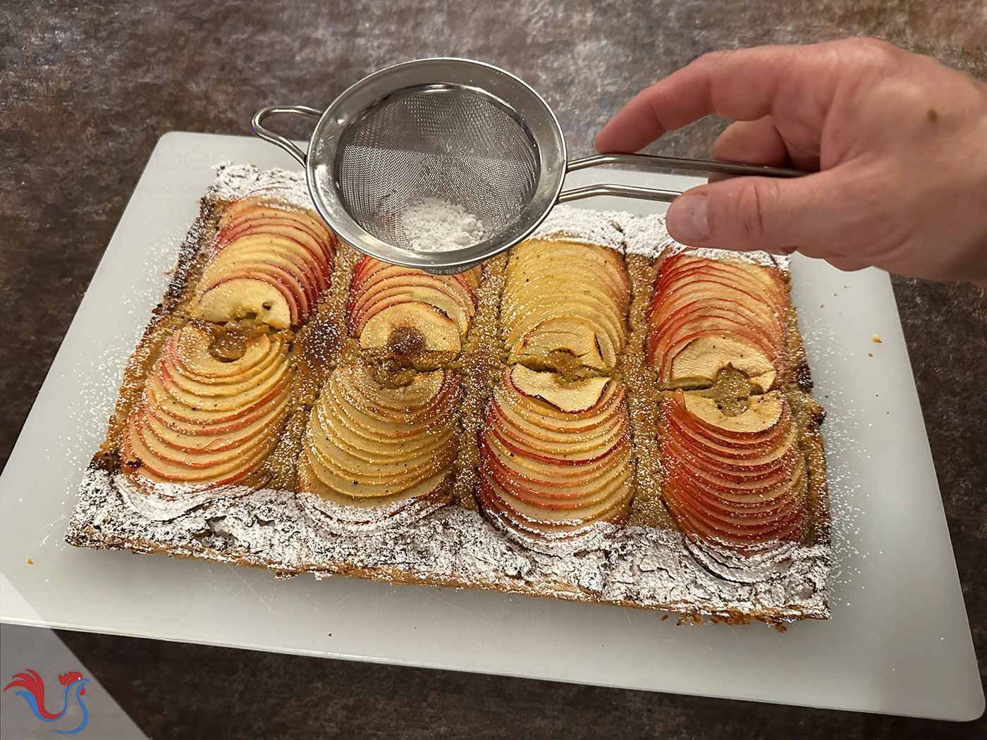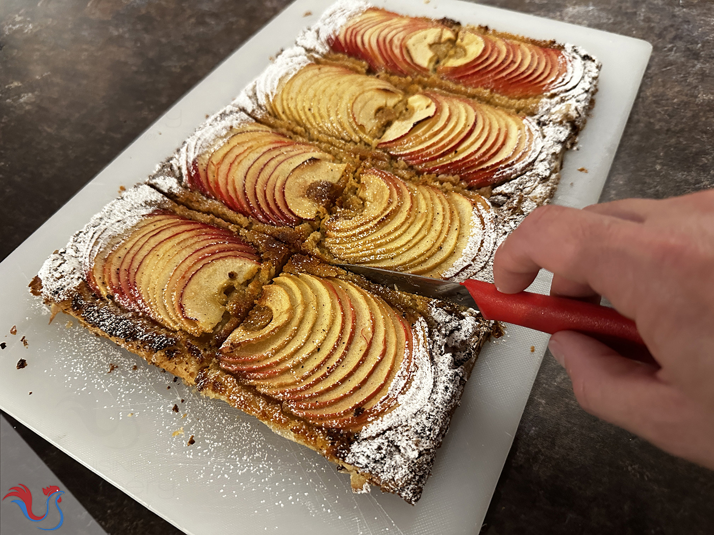 Voici une recette de feuilletés aux pommes, cuit en tarte que l'on découpe, à la manière des feuilletés pommes trouvés en pâtisseries
