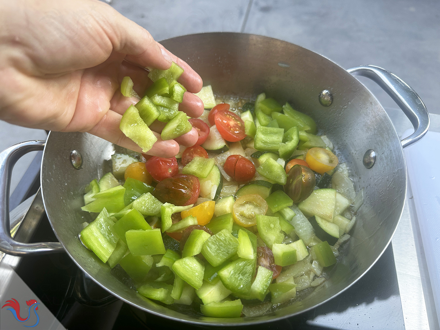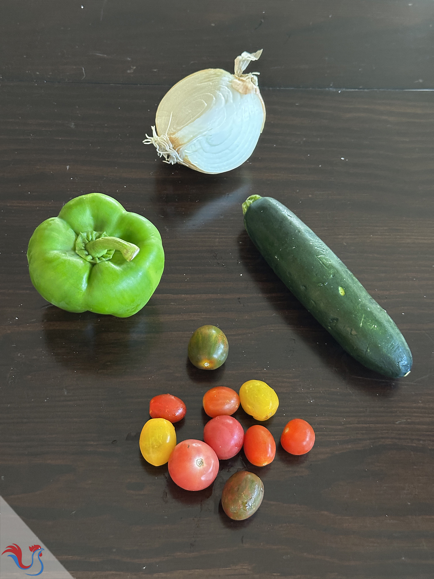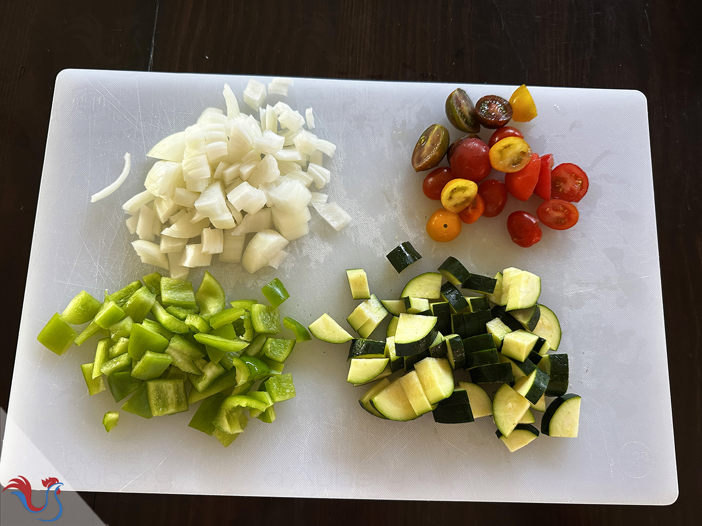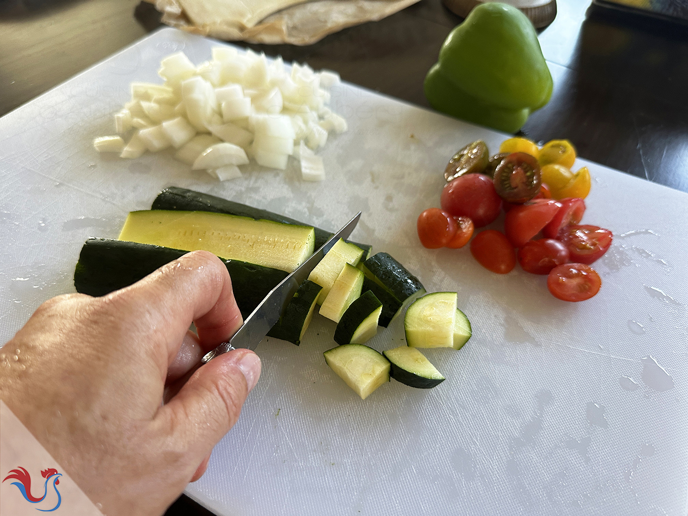 11. Laver et émincer les légumes: l'Oignon Rouge, la Courgette, le Poivron Vert. Couper en deux les Tomates Cerises