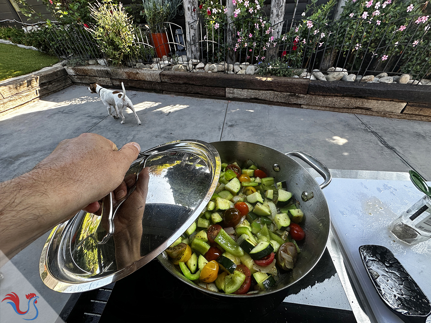 En ouvrant le frigo et en me grattant ma tête, je me demandais comment ne pas jeter les quelques légumes qui me restaient: une pauvre courgette qui commençait à se sentir seule, des tomates cerises qui commençaient à se fripper comme la mémé Jeantet de Vouvray, une moitié d'oignon qui me regardait avec des gros yeux enervés d'un syndicaliste prêt à me guillotiner (salaud de riche prêt à jeter ses légumes), et un poivron vert qui en devenait rouge de désillusion d'avoir fait des rondes trop longtemps dans le compartiment légumes.