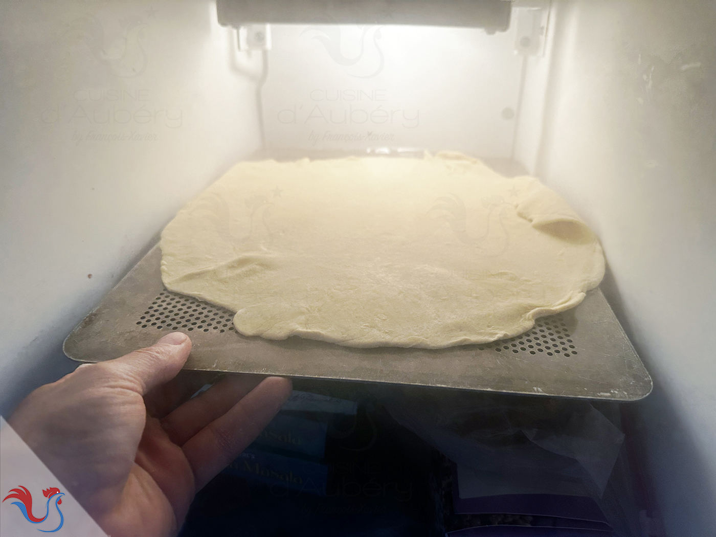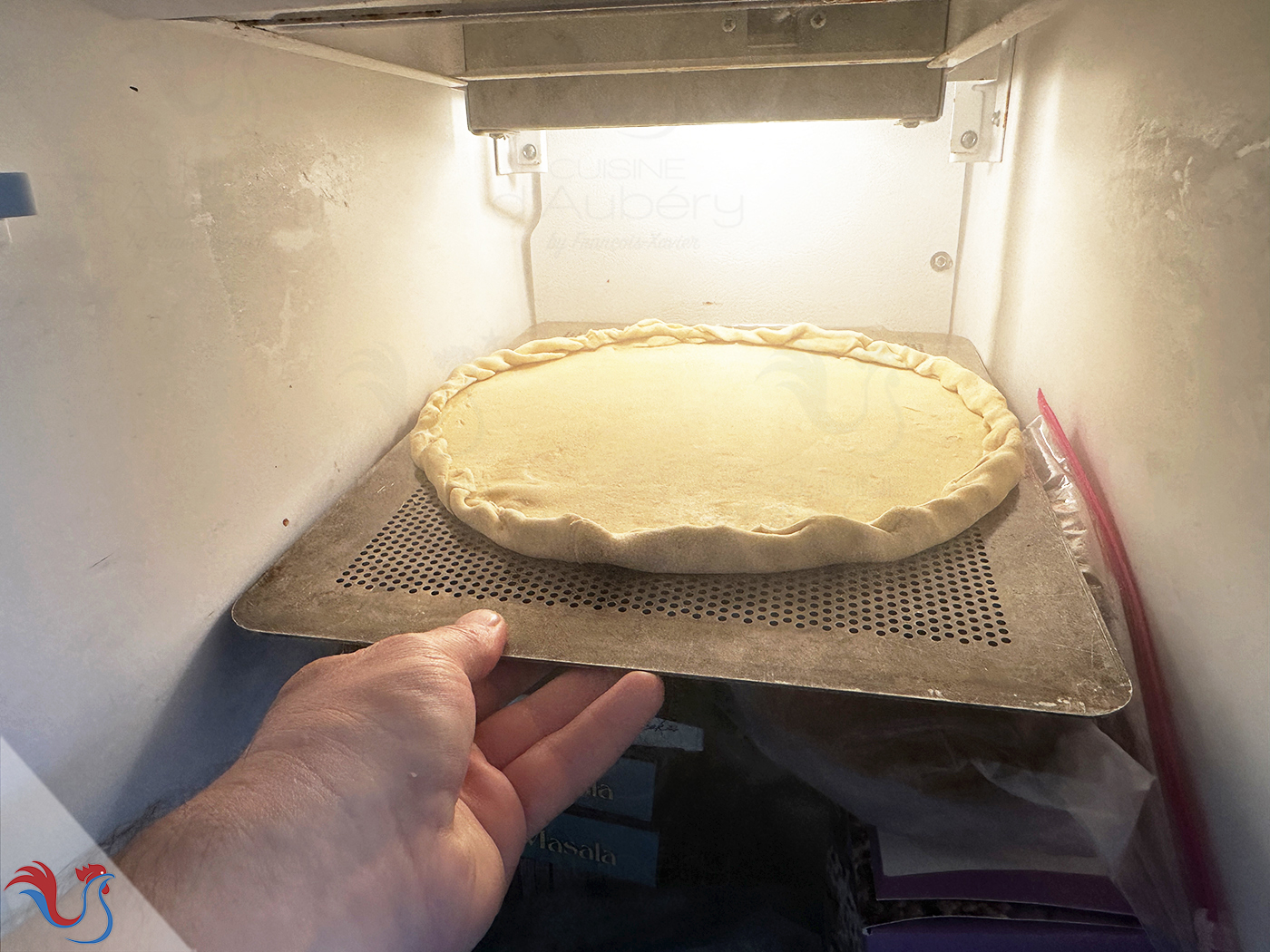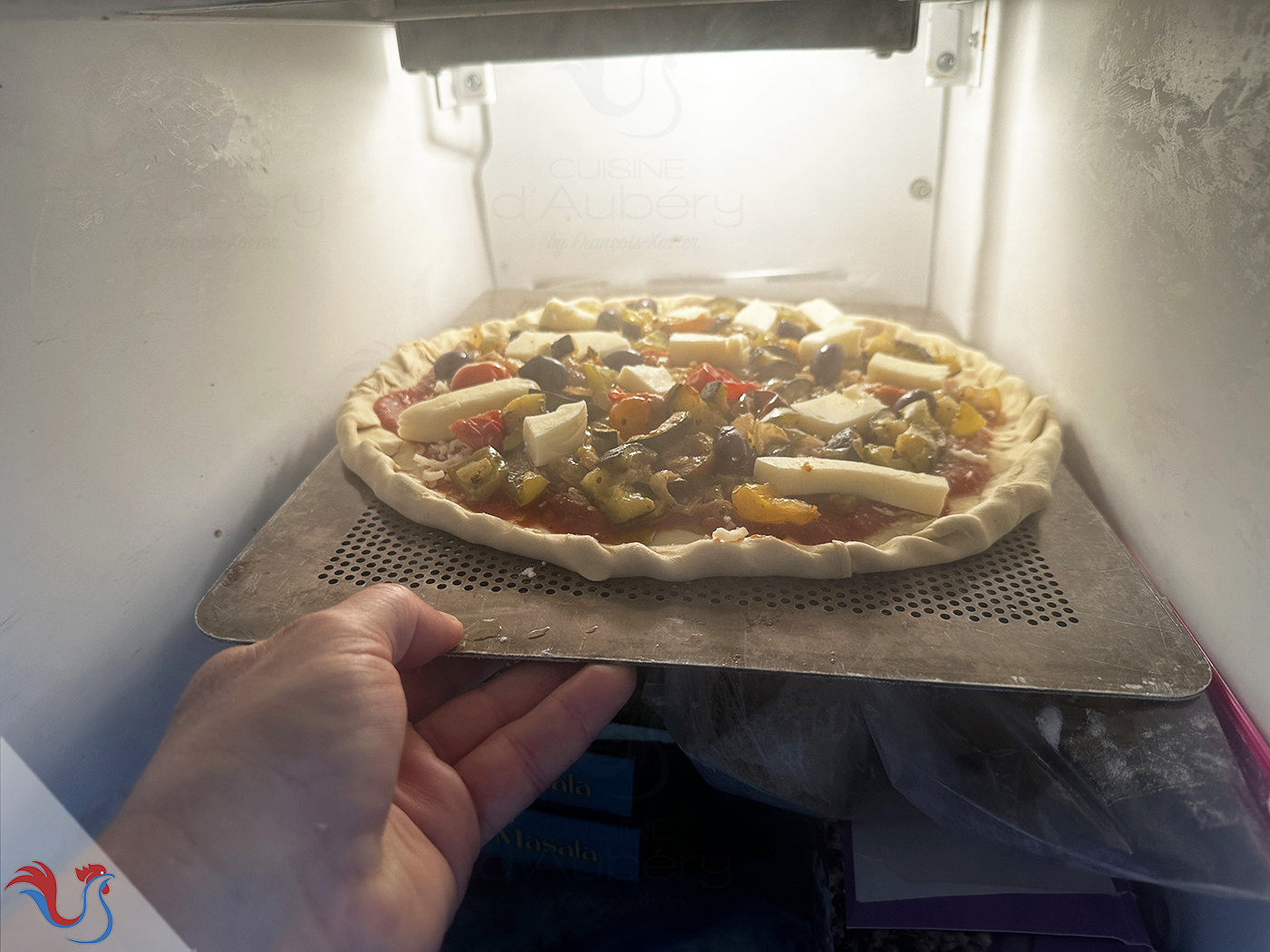 27. Ensuite, je repasse la pizza au congélateur, 10 minutes, car elle a commencé à prendre en température. Il vaut mieux qu'elle soit bien dure pour pouvoir la glisser sur la pierre chaude sans qu'elle n'accroche à la plaque.