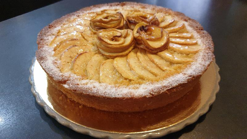Cette tarte épaisse aux pommes est en effet très gourmande, avec des pommes confites ultra fondantes, et une crème cuite aux saveurs de noisette